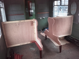 LNER 52255 Overhaul and re-furbish started with the Paint Shop volunteers dismantling the interior. The new seat ends are assembled at the Bewdley workshop.