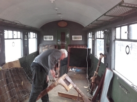 LNER 24105 Wheel chair carriage is taken out of service for overhaul and refurbishment. Seating dismantled, seat backs and bases retained for use in the new seating.