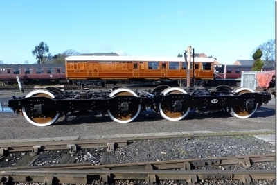 2 views of the carriage, view on the right also showing the refurbished bogies awaiting fitment